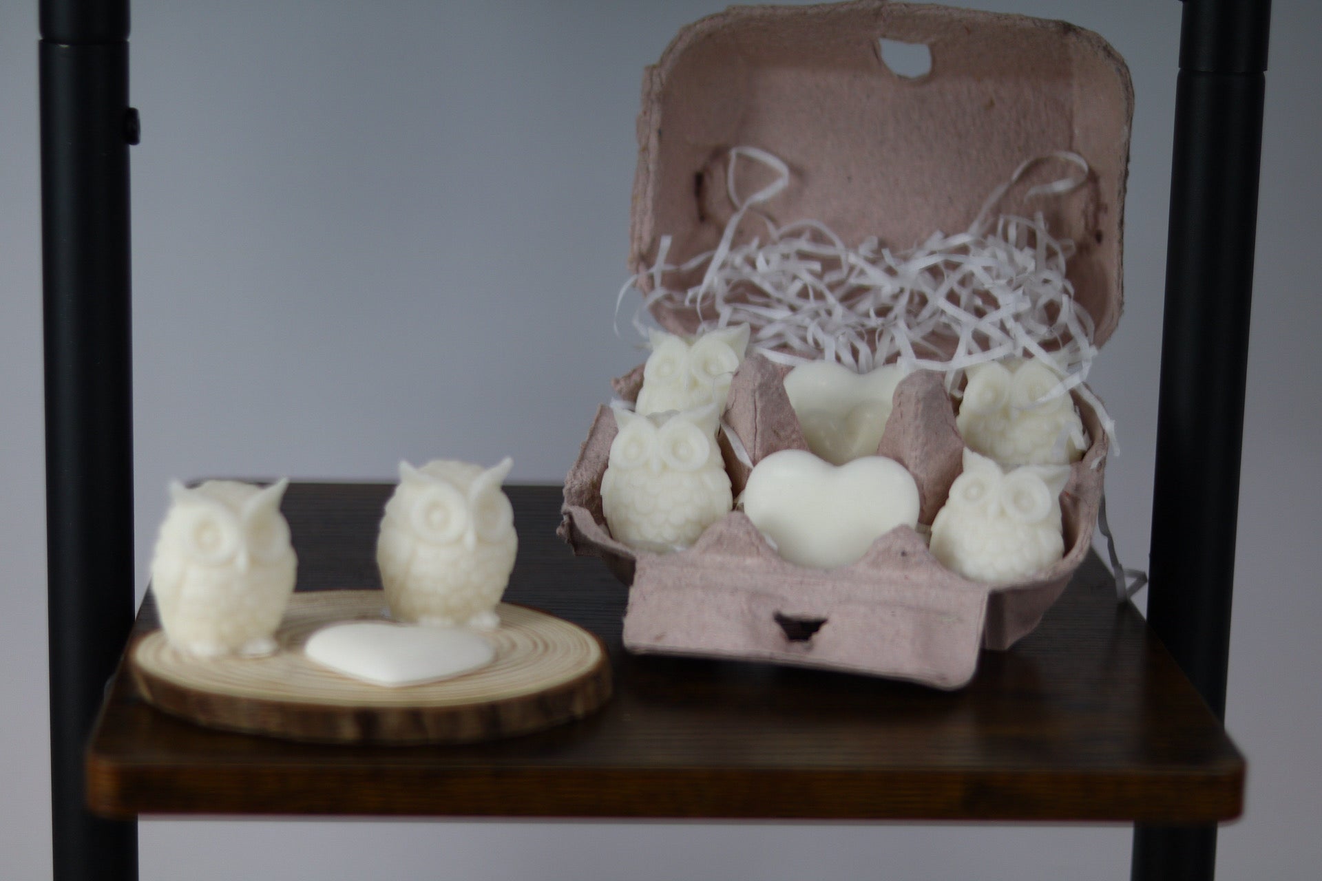 Set Includes 6 34g Owl Wax Melts and an Additional 6 Different size heart Melts.