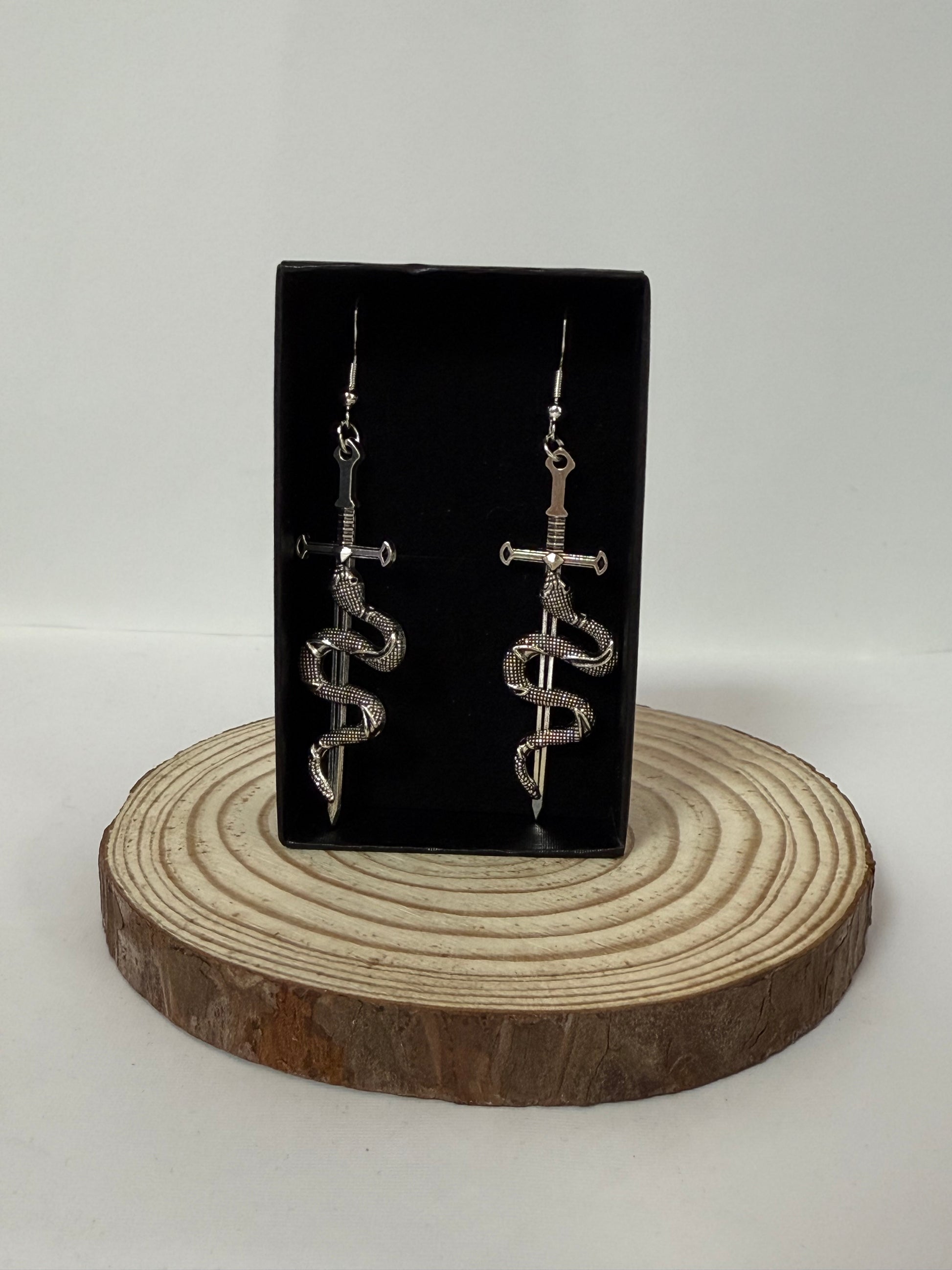 Featuring a striking design of a snake coiled around a sword, these bold earrings are guaranteed to make a statement.