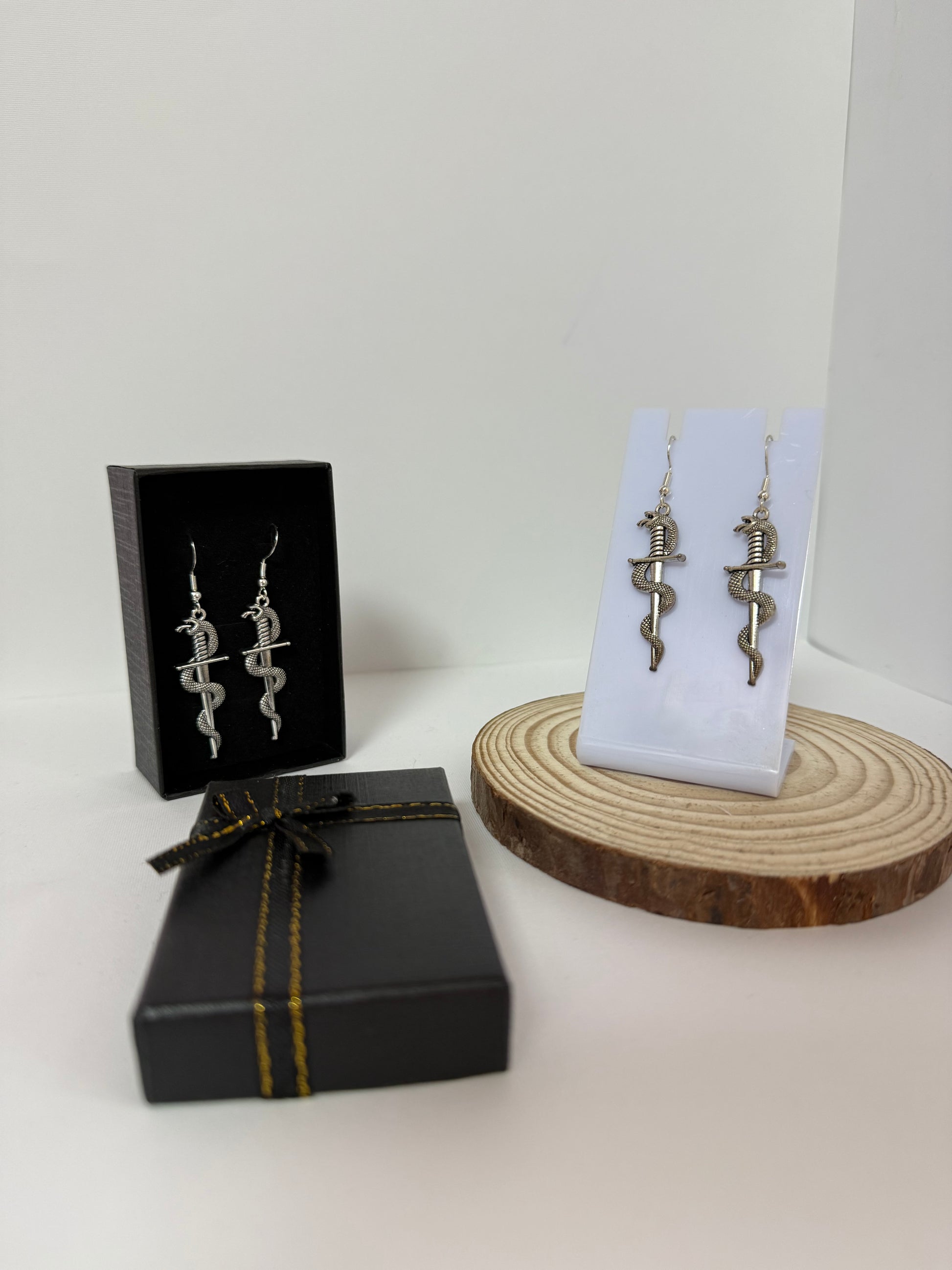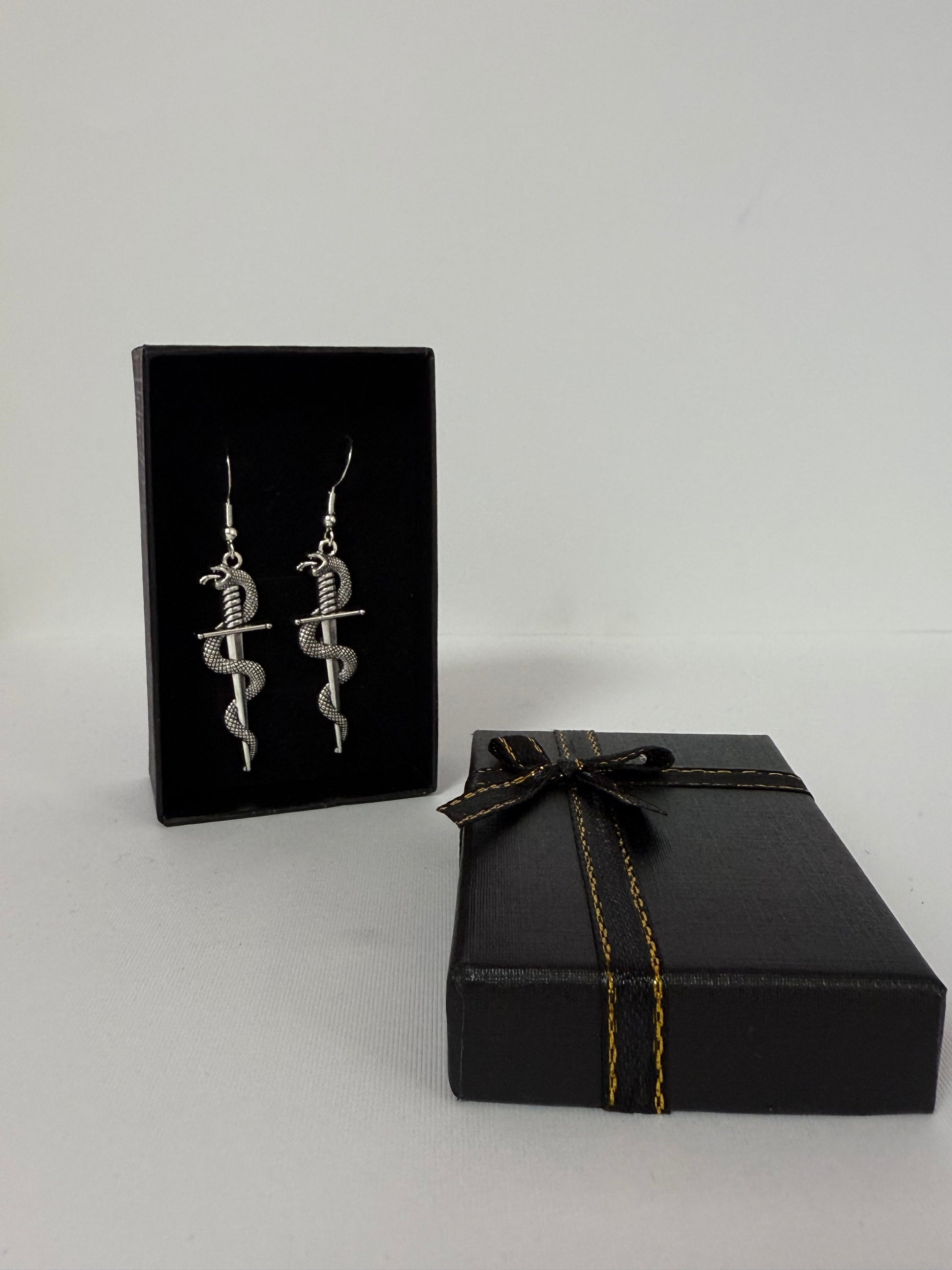 Featuring a striking design of a snake coiled around a sword, these bold earrings are guaranteed to make a statement.